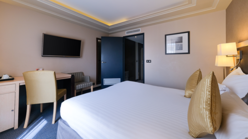 La chambre de 23m² d’une capacité de 2 personnes est climatisée. Vous pourrez profiter d’un espace de vie avec lit double ou lits jumeaux (2 lits de 90x200), d’une TV, d'une machine à café, d’un accès Wi-Fi ainsi que d’une salle de bain. La salle de bain est composée d’une douche ou d'une baignoire et d’un WC. Le linge est fourni et la chambre offre une vue sur les bâtiments environnants.